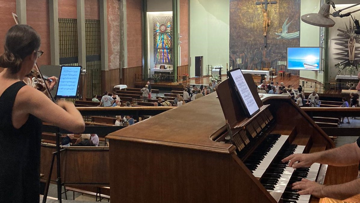 Al haberse estropeado a última hora el harmonium de la capilla, hemos tenido que llevar el teclado.